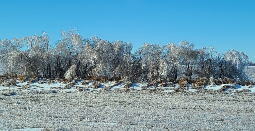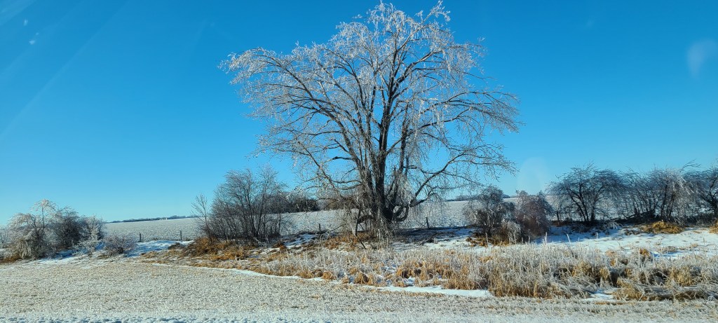 Heather left her earbuds at work so we swung by there quick. We had received a fair amount of freezing rain and drizzle a few days before we left. The city quickly ran out of salt and to make matters worse, the neighbor behind us had a bum foot AND then slipped and fell and broke two ribs. So I wanted to put down salt for us and for him before we left so I dumped two bags of salt down trying to get rid of most of the ice in our driveway. The day we left the sun was out and chunks of ice were falling off the objects it clung to but there was still plenty of ice hanging on. The following photos are from the trees we saw as we headed out of town. There is more I’d like to write about but some things should not be public. Lets just say I got stopped and Kaitlyn saved me by saying “mom can’t find your razor”