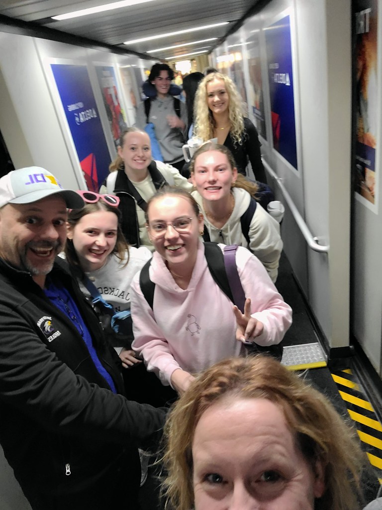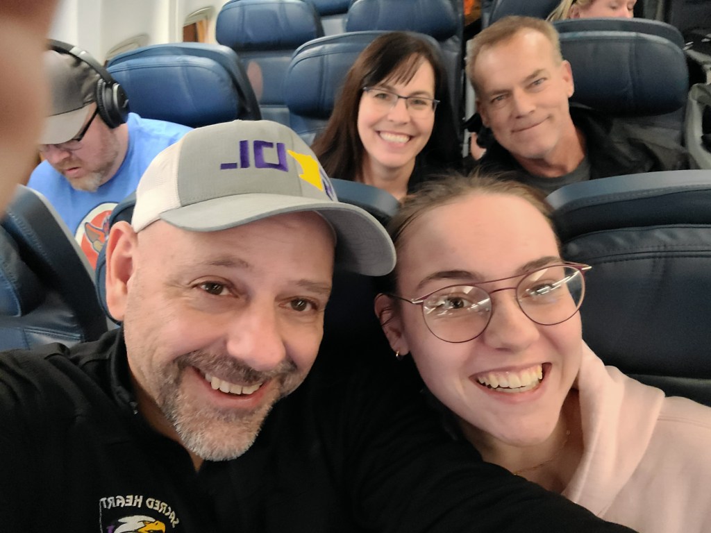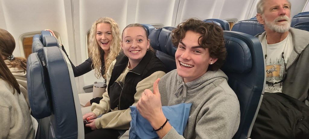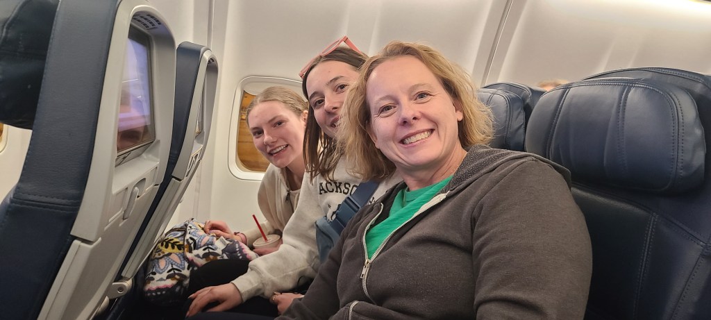 I get a little confused sometimes with how airlines do things now. We had our tickets on our Fly Delta app. We checked in at the self check-in screens using our phones. We checked one piece of luggage each and you had the option of printing boarding passes which we did but Augers did not. THEN you have to go to another line to physically hand the bags then the agent checks your Passports as well. I guess I question whether it would have been faster to just go directly to the agent but whatever. Lines were fairly short and we had 1.5 hours before the flight left. The TSA agent stopped Sophie and asked her a bunch of questions like what sports she plays and what position? It was all in good fun.