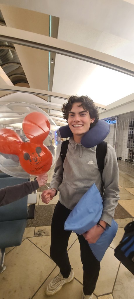 It felt cool when we came off the airplane and into the airport. There was a balloon left at the gate that I am guessing some poor kid couldn’t take with so it just hung there at the gate. Leighton was the about the tallest kid that could jump up and get it.