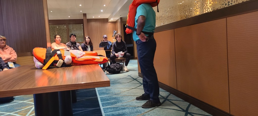 The first thing we do is figure out our muster station, or muenster station as Heather called it. The two families were in one area, the Horizons Restaurant, while Kaitlyn and Ally had a different location. We said go to your muster and meet around Guy’s Burger when finished.