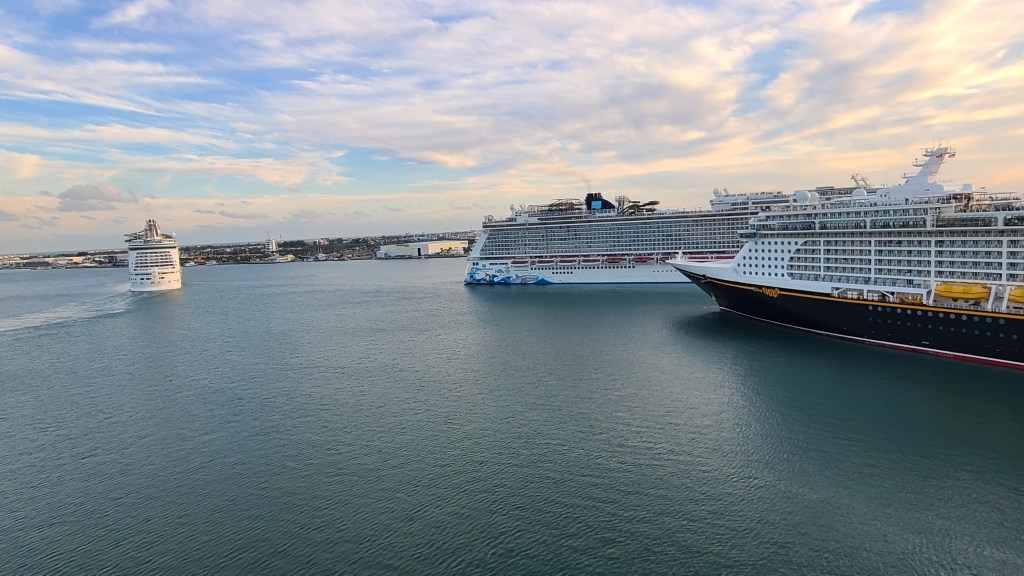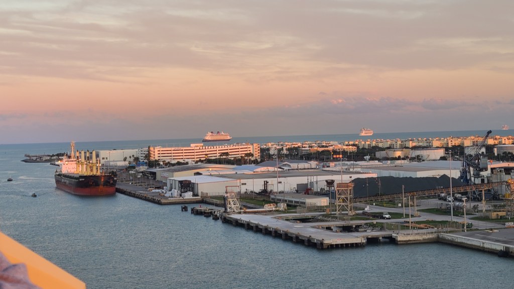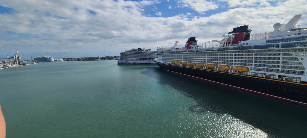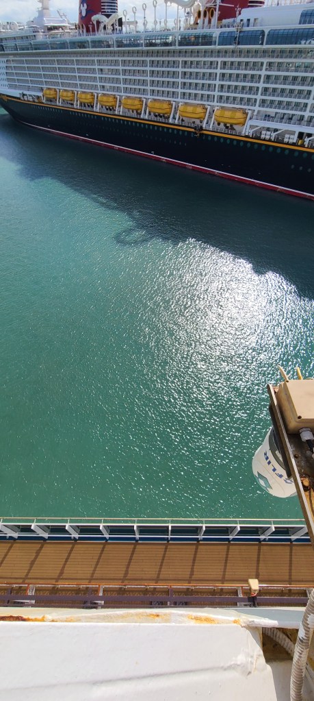 We were told there were 6 other ships in port but we only found 5, either way it was busy and we though we were supposed to depart at 4pm we didn’t leave until 5. We jokingly blamed it on Leighton because before this he set off an alarm by going out a door he wasn’t suppose to in the kids club.