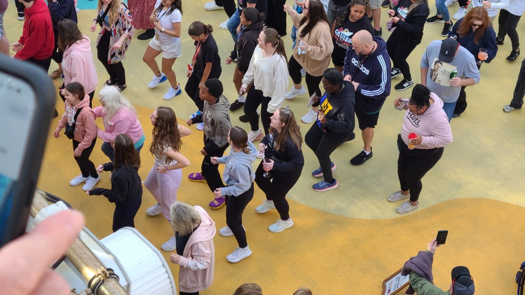 Later that night Ella wanted the shoes Sophie had on but Sophie and Kate took off and never came back to the room so Ella was upset. We went looking for them but never found them. We went to the comedy club but it was 18+ and they wouldn’t let Leighton in which was the first strike in this BS about being 17 and really being too old for the kids club but not old enough for anything else at night. About 5 to 10 minutes in the bouncer left and we tried to get Leighton to come back but he never did. The comedian was a high pitched 58 year old man to which Chris was never sure if he was a man or someone transitioning. We told Chris however that the first half of his routine was about him being a man with a high pitched voice.