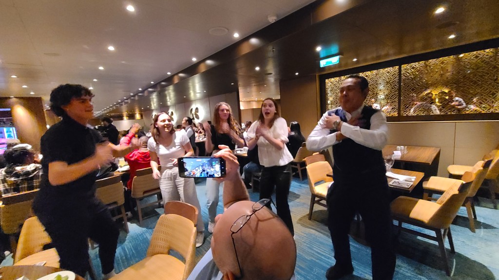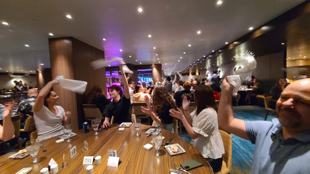 But at least they started to entertain us. The main lady would say over the speaker to her servers…”10 minutes to shhhhhhhoowww time” “5 minutes to shhhhooowww time”. It became just one of many things we repeated throughout the cruise. Shhhooowww time started and we started throwing our napkins around like we were at an old fashioned German wedding.