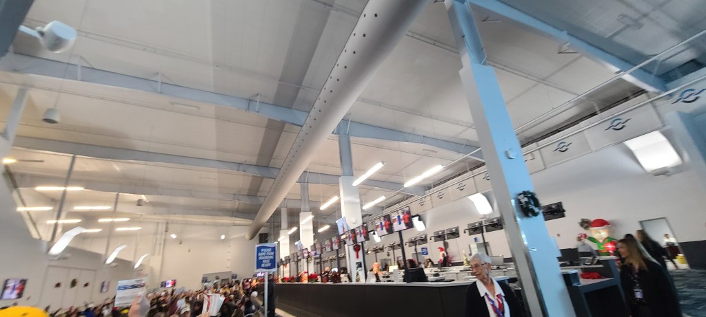We get inside and there is no picture taking or video recording apparently. I didn’t see that notification cause I was videoing. Anyway, you do zig-zag through just a bit once inside and there are many stations that everyone in your stateroom walk up to with your boarding passes. Was cool to watch Ally and Kaitlyn walk up to one of the stations just those two. Everyone had to have their own boarding pass in their hand.