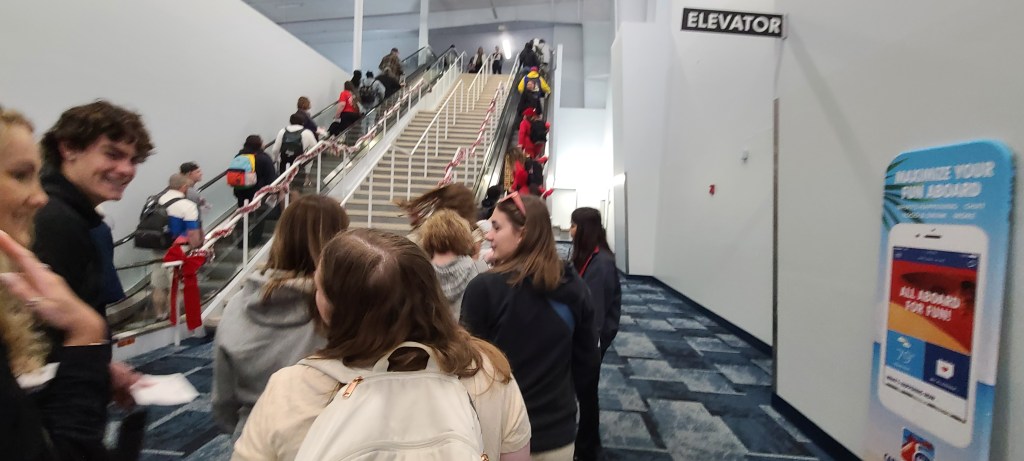 Because we were early they hadn’t even started boarding yet. So they crammed us into this holding area and told us to get comfortable with the person next to you, there can be no open seats because they have to fit thousands of people into this area. I did sneak a couple of pictures while we waited.