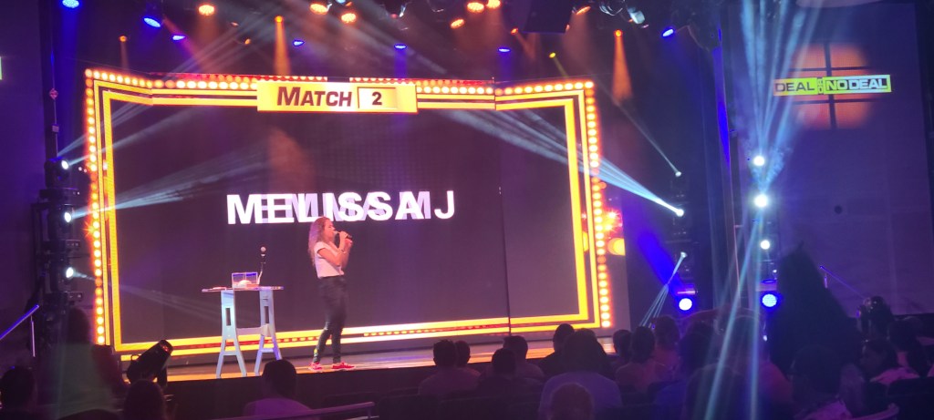 The second contestant that went up however turned interesting. Ella was getting matches on her card. So we would look at her card and what match she needed and what cases were not opened yet with the contestant on stage. So we would yell out the case we wanted open in hopes that it would match Ella’s. Chris however, just kept yelling in a loud, weird voice, “ELEVEN!” to which this just became something the kids would just yell randomly the rest of the cruise and even afterwards. It would make Sophie laugh every time. It came down to the last two cases and if Ella matched one more she would win $200 in on board credit.