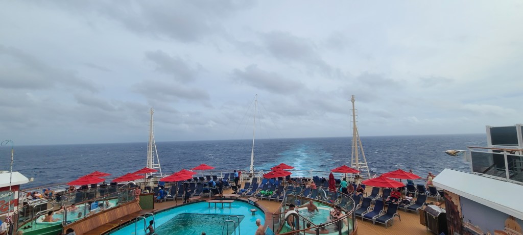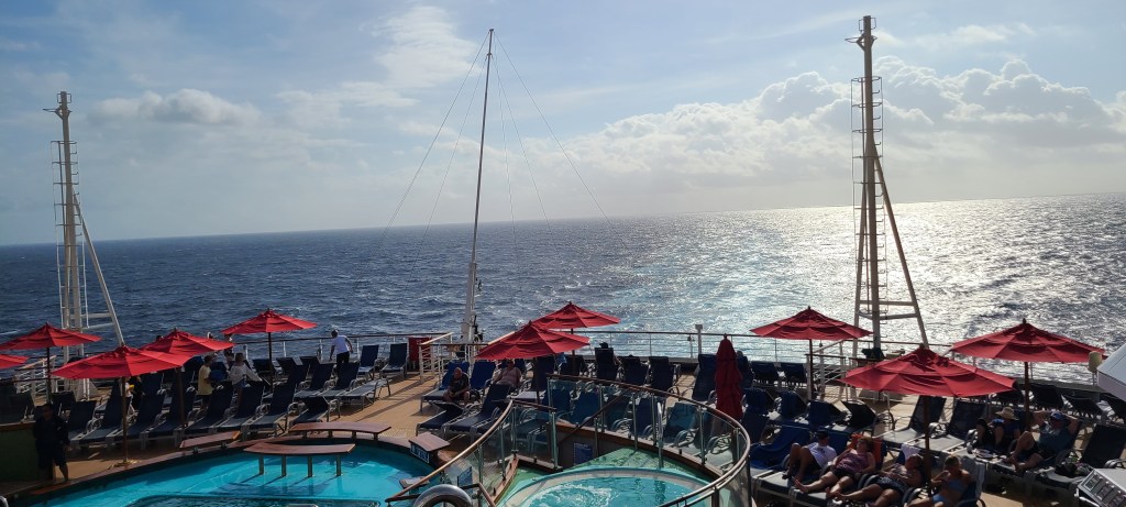 We also noticed because they were dry docking the next day there were already things being taken down. Chairs and such in the library were being stacked up. Some said that things were being stacked in the casino as well. Umbrellas in the back of the ship were taken down completely. You could tell they were getting ready. While it sounded like much of the entertainment staff was getting off the ship…and they let us know that quite a bit the last few days and you could tell they sort of were starting to mail it in….other staff stay on and start taking stuff apart the moment everyone is off the ship. They tear thing apart as they take the 10 day trip across the Atlantic and dock in Spain. So by this point, were noticing changes beginning to happen already.