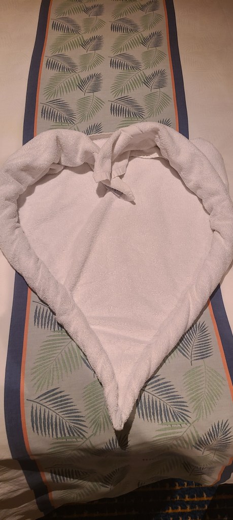 By the time volleyball was done we were all ready to go inside and warm up. We get back to the stateroom later in the afternoon to find our final towel “animal”.