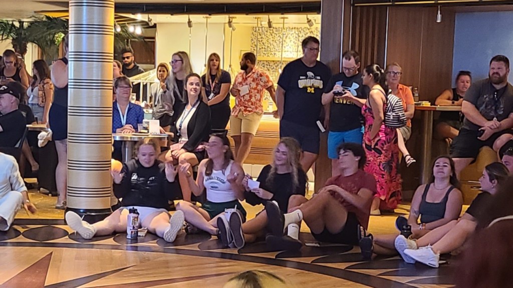 Very unfortunate that he sort of fit the meme. After Chris and Heather did some sleuthing, we heard two variations of the story. One was that he was dunking and holding other kids under water in the hot tub and one of the kids belonged to the guy in the other hot tub. Another version was that he was groping other kids in the hot tub. This kid had apparently been known to people and security during the cruise as he would ask random people if he could use their bathroom or would ask the crew if they would buy him a drink. We did hear two people being called a number of times to come to the service desk and we speculated whether they were trying to find his parents.
