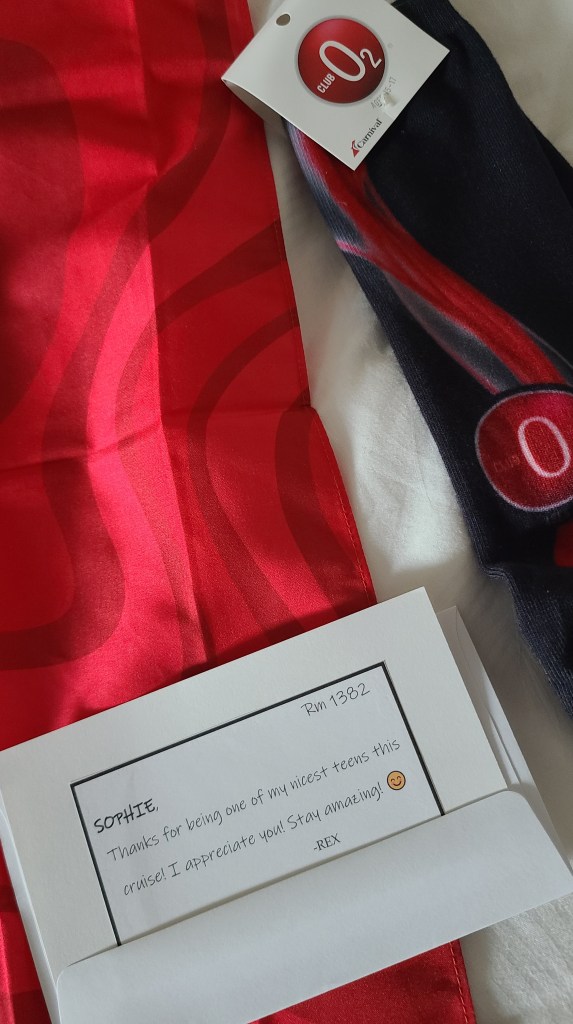Both Sophie and Kate got this from their Club O2 director. It was so awesome. Sophie really came shining through in this cruise and it was so fun to see her just open up, be herself, and not care what others think! Sophie would say Kate would often start conversations with people but she would end them meaning, all it would take was for Kate to break the ice for her and she ran with it!